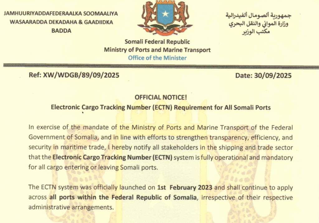 In accordance with the directive issued by the Ministry of Ports and Marine Transport (Ref. No. XW/WDGB/89/09/2025, dated 30 September 2025), the Electronic Cargo Tracking Number (ECTN) will be mandatory for all containers arriving to all ports within the Federal Republic of Somalia, starting 14 October 2025.