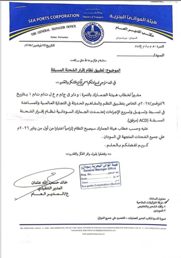 The Sudan Customs Authority has formally announced the nationwide implementation of the Advance Cargo Declaration (ACD) system, as per its official circular dated 9 November 2025.