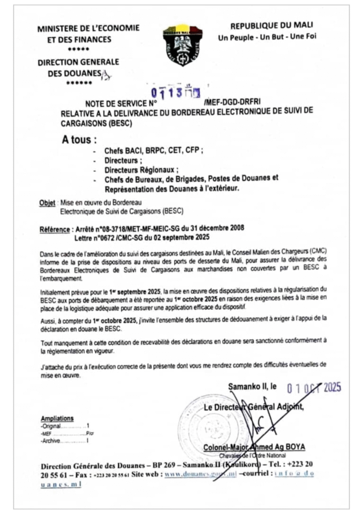 The Malian Customs Authority has announced an official directive enforcing the use of the Electronic Cargo Tracking Note (ECTN) for all shipments.